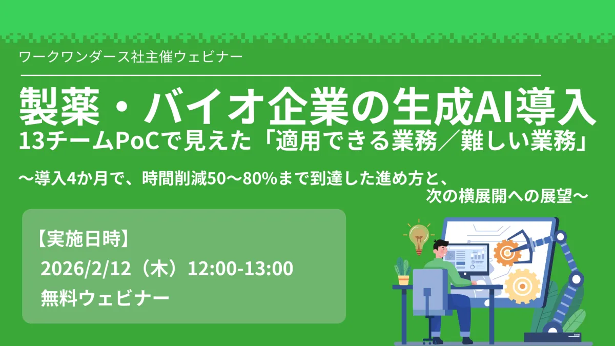 製薬・バイオ業界の未来が、AIの力で大きく変わろうとしています。2026年2月12日に開催されるセミナーでは、実際の事例をもとに、生成AIの導入がもたらす実利について詳しくお話しします。このセミナーでは、42名の参加者による13チームが4か月間のPoC(Proof of Concept)を通じて得た、最大50〜80%の時間削減に至るまでのプロセスと方法を公開する予定です。