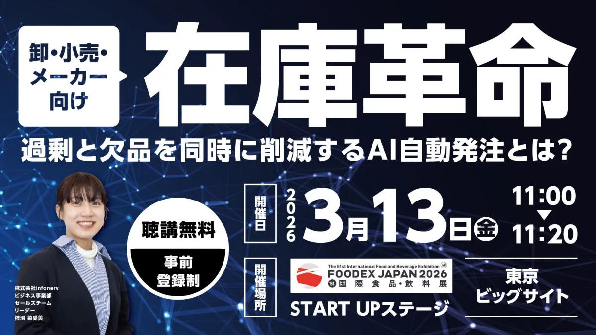 2026年3月10日から13日まで東京ビッグサイトで開催される国際食品・飲料展示会「FOODEX JAPAN 2026」において、株式会社infonervが特別セミナーを開講します。これにより、在庫管理業務における効率化という現在のビジネス課題に挑戦します。
