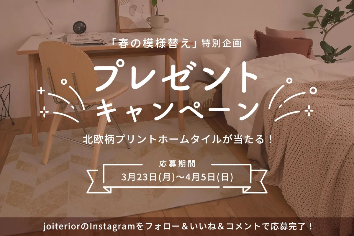日本絨氈株式会社(本社:大阪府堺市)のECサイト「joiterior(ジョイテリア)」が、春にぴったりの「新生活のお部屋をアップデート!キャンペーン」を始めました。このキャンペーンは、北欧柄のホームタイルカーペットをテーマにしたもので、インスタグラムでのフォロー&コメントで簡単に参加でき、なんと抽選で5名にその商品をプレゼントするという内容です。