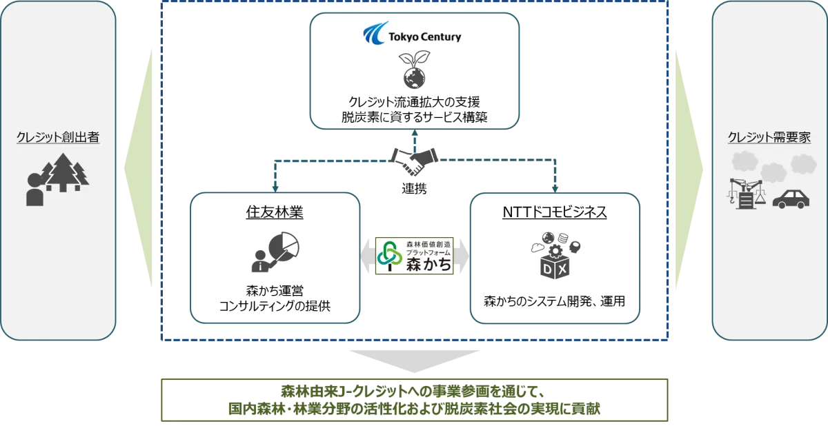 各企業はそれぞれ異なる役割を持ち、この新しいプラットフォームの発展を支えます。東京センチュリーは、森林由来J-クレジットの取引事業を行い、需要家に対する安定的なクレジット供給を目指します。