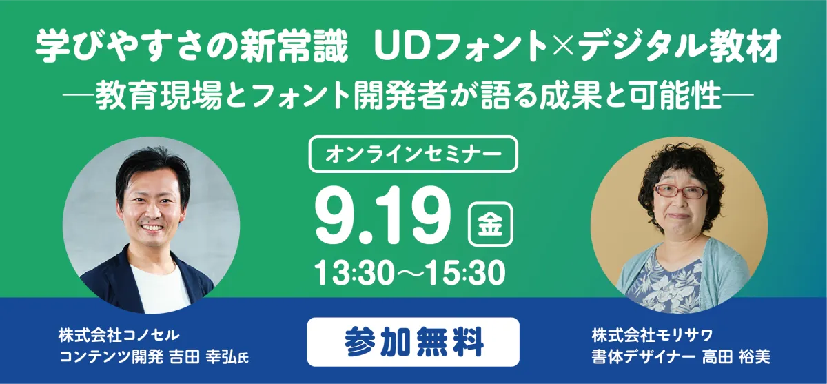 株式会社モリサワでは、教育分野に携わる皆様向けに無料オンラインセミナー『学びやすさの新常識 UDフォント×デジタル教材 ―教育現場とフォント開発者が語る成果と可能性―』を開催します。このセミナーは、2025年9月19日(金)にZoomを使用して行われ、参加は無料です。
