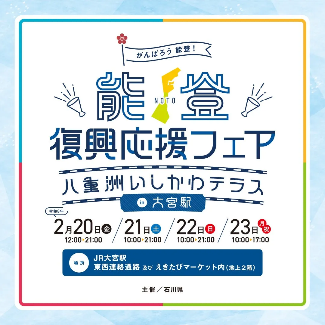 2026年2月20日から23日まで、JR大宮駅において「能登復興応援フェア~八重洲いしかわテラス in 大宮駅」が行われます。本イベントは、石川県が誇る能登地域の魅力を発信し、昨年の能登半島地震後の復興支援を続けることを目的として開催されるものです。来場者は、能登の美味しい食材や伝統工芸品を通じて、地域の活気と豊かさを感じることができる特別な機会となります。