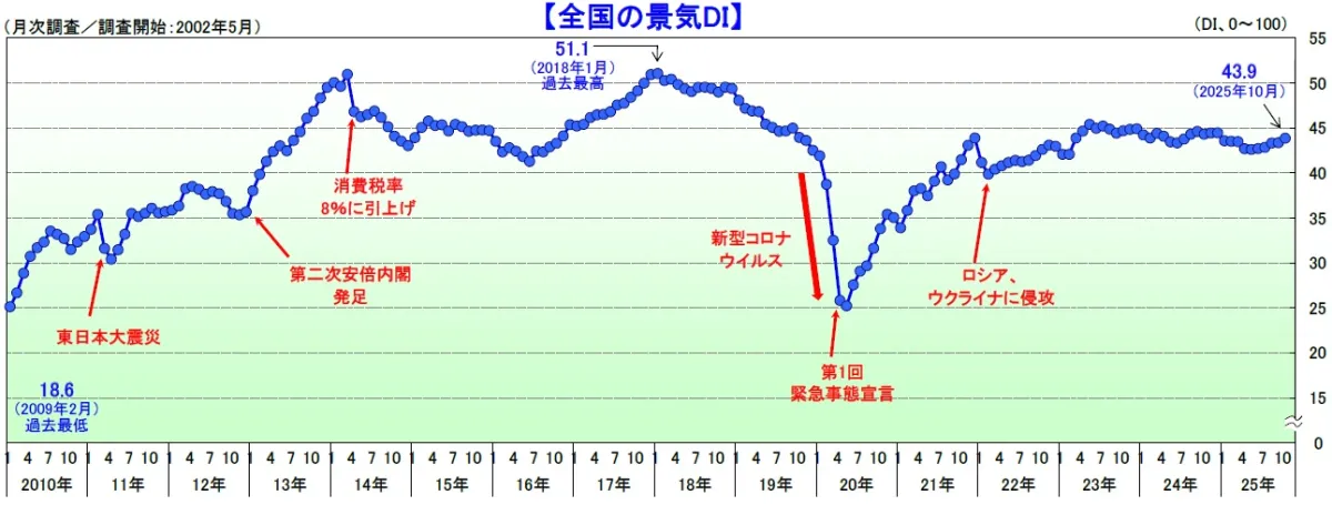 2025年10月の国内経済の景況感が改善を続けています。株式会社帝国データバンクが実施した調査によると、景気DI(ディフュージョン・インデックス)は43.9と前月比で0.5ポイント増加し、これで5カ月連続の改善となりました。この動向は、新政権への信頼感から株価が上昇し、設備投資が活発化していることが背景にあります。
