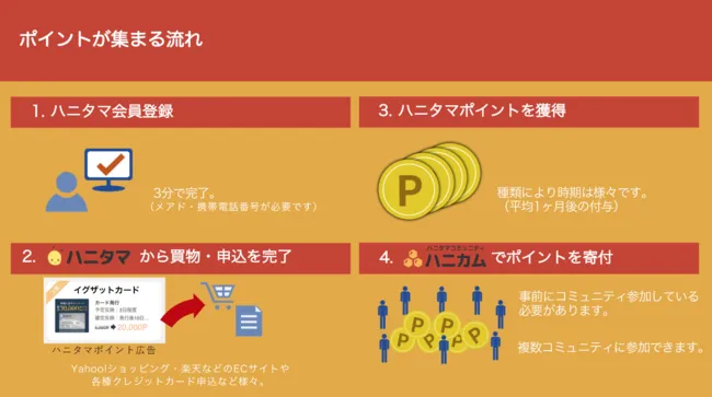 『ハニタマ』は、インターネット上の購入やサービス利用によって貯まるポイントを利用者が選んだ団体に寄付できる仕組みです。たとえば、ネットショッピングや宿泊、ツアー予約を行うことで、利用者はハニタマポイントを獲得します。そのポイントを各種コミュニティに寄付することで、地域の活動に貢献できるのです。