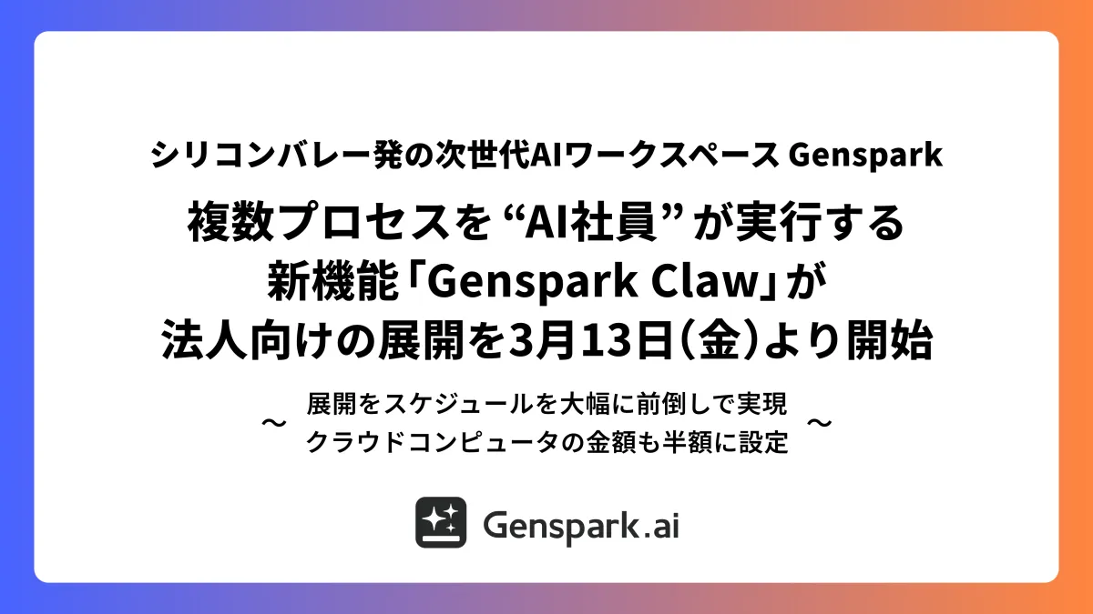 「Genspark Claw」を法人向けに来年3月13日から展開することを発表しました。この機能は、AI社員が複雑な業務プロセスを実行するもので、企業の業務効率を大幅に改善することが期待されています。
