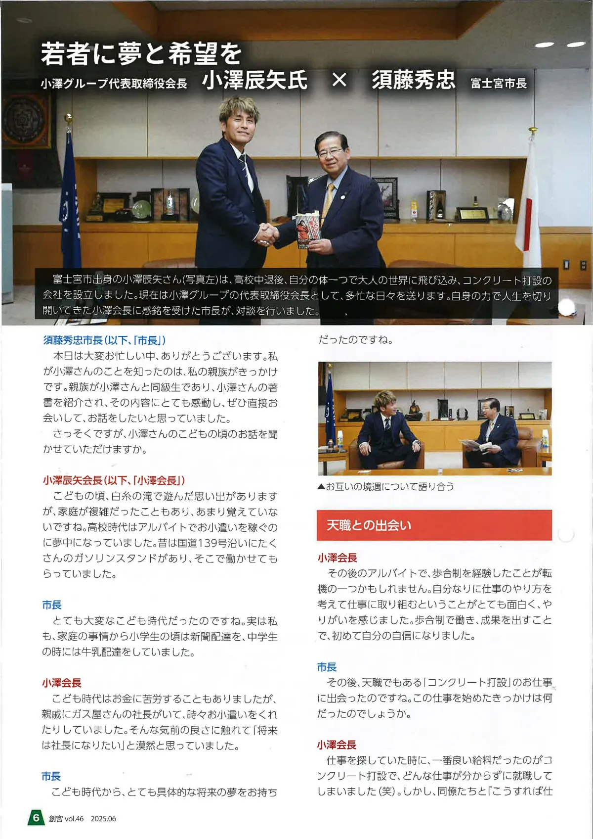 富士宮市の広報誌『創宮(そうぐう)』の最新号で、小澤グループの代表取締役会長、小澤辰矢氏と富士宮市市長、須藤秀忠氏との特別対談が掲載されました。この対談のテーマは、「若者に夢と希望を」。