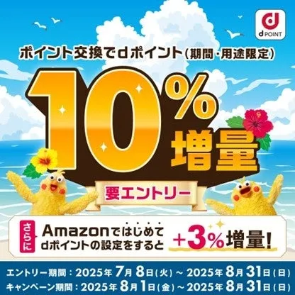 株式会社NTTドコモは、2025年の夏に「ポイント交換でdポイント10%増量キャンペーン」を開催することを発表しました。キャンペーンは、対象企業のポイントをdポイントに交換することで、通常では得られない追加リワードを手に入れる企画です。