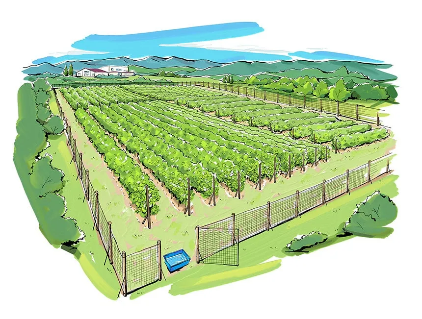 原木園は、ワイン用ブドウの苗木の基盤を育てる特別な施設です。フランスなどでは長年このシステムが確立されていますが、日本ではまだ始まったばかりです。ここで育つブドウ樹は厳正に管理され、ウイルスを避けた健康な苗木として各地で積極的に活用されることを目指します。