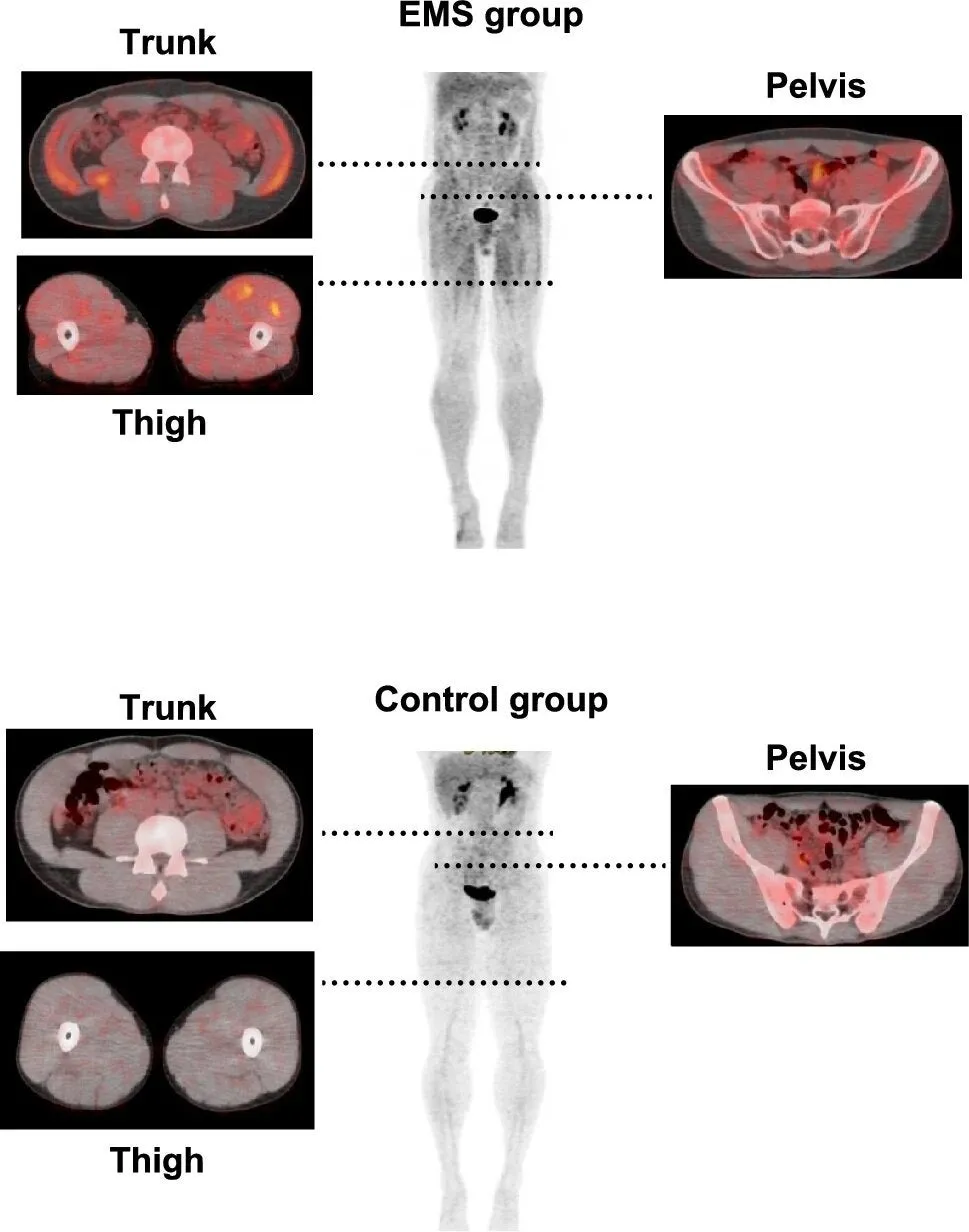 健康な成人男性16名を対象に、無作為に干渉低周波を受けるグループと通常の安静状態のコントロールグループに分け、それぞれFDG-PETを用いて筋肉活動を評価するという方法が取られました。干渉低周波群は、腰と大腿の近位部に電極を装着し、その後にPETスキャンを実施しました。