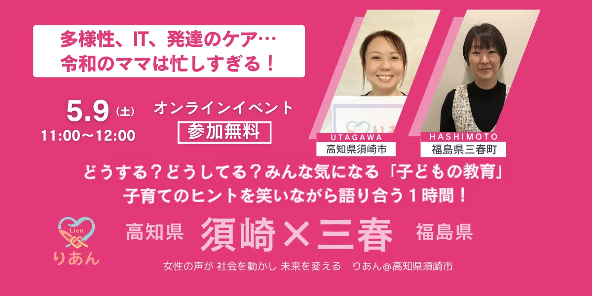 高知県須崎市に拠点を置く女性支援施設「りあん」では、福島県三春町の保育士・橋本愛氏をゲストに招いたオンライン座談会を2026年5月9日に開催します。このイベントのタイトルは『多様性、IT、発達のケア…令和のママは忙しすぎる!〜子育てのヒントを笑いながら語り合う1時間〜』です。