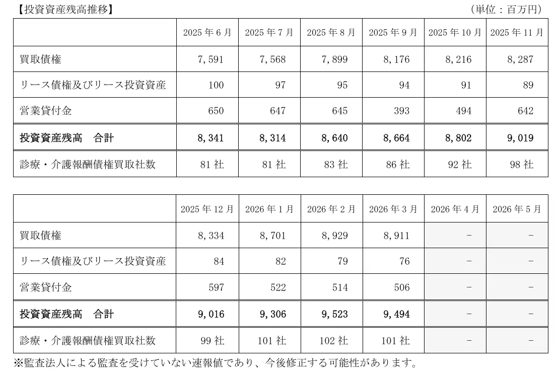 2026年3月末時点でのD&Mカンパニーの投資資産残高は、前月比で29百万円減少し、合計9,494百万円となりました。この減少は、債権買取社数が1社解約し、買取債権が18百万円減少したことによるものです。しかし、営業貸付金が回収されたことも影響し、全体的な資産残高は依然として高水準を維持しています。