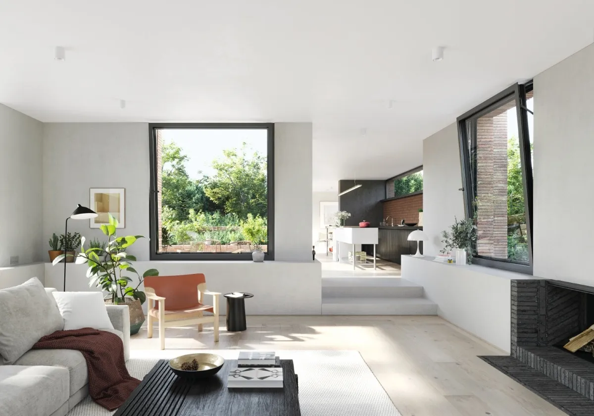 「Schüco AWS 90 BS.SI+」の最大の魅力は、特に大開口を実現する能力です。幅は570mmから1,700mm、高さは最大2,700mmまで製作が可能で、重量のあるトリプルガラスを使用する場合でも、ドレーキップの障子重量は最大160kgまで支えることができます。これにより、床から天井まで届くような圧倒的な開口を可能にし、自然光をたっぷりと取り入れられます。