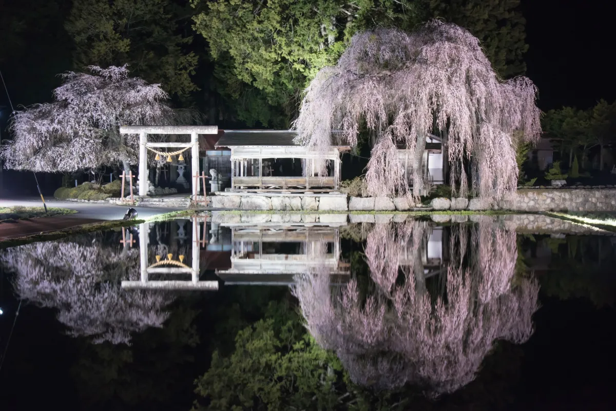 高山の春を彩る美しい枝垂れ桜のライトアップ