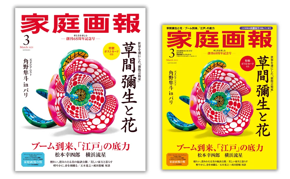 国内外でその名を馳せる前衛芸術家、草間彌生さんが『家庭画報』の表紙を飾ります。この特別号は、創刊68周年を記念したもので、草間さんの立体作品《私は花を抱いて毎日を過ごしている》が紹介されています。今年の3月号は、これまでの『家庭画報』の表紙デザインとは一線を画しています。