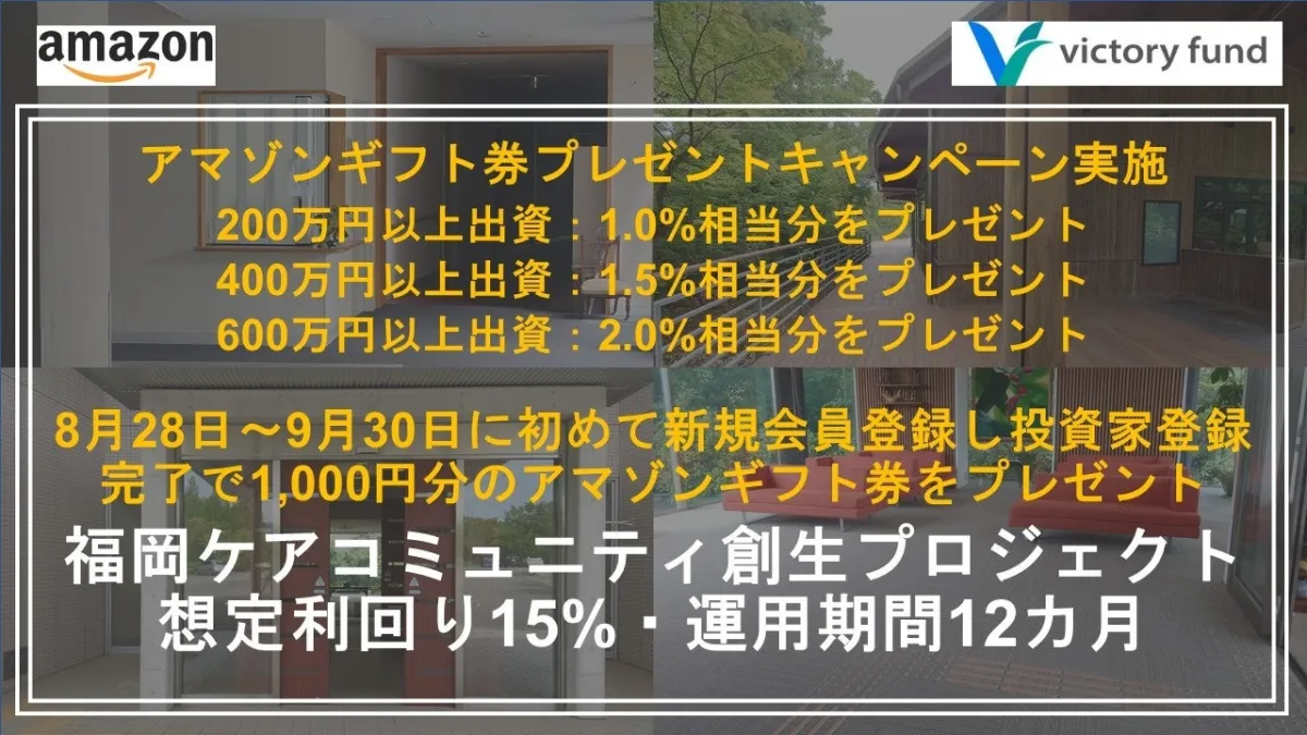 今回のファンド名は『victory fund第39号福岡ケアコミュニティ創生プロジェクト』。出資可能額は10万円からで、最小出資額は1口1万円です。総募集金額は6億円で、募集期間は2025年9月1日から16日までとなっています。