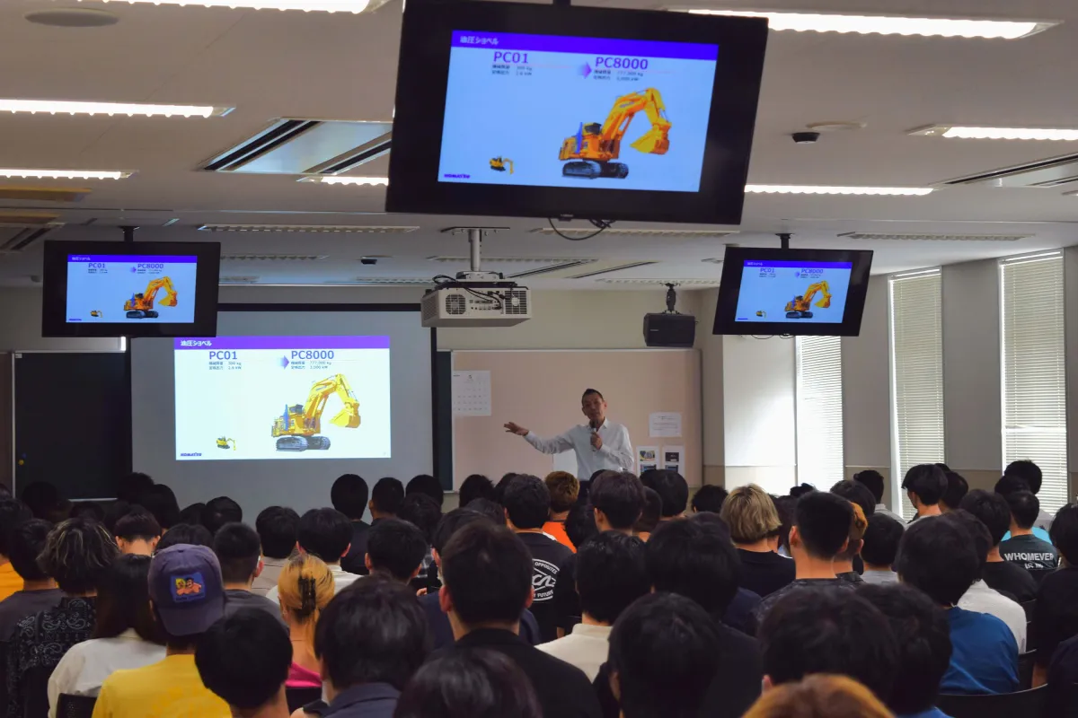 四家氏は福島の企業として数々のイノベーションを成し遂げてきたコマツの歴史や、挑戦することの重要性について語りました。特にDX(デジタルトランスフォーメーション)時代に求められる人材像についても触れ、若者たちへの応援のメッセージを送る場面もありました。また、講演は活発な質疑応答で盛り上がり、学生たちの興味を引き続ける内容でした。
