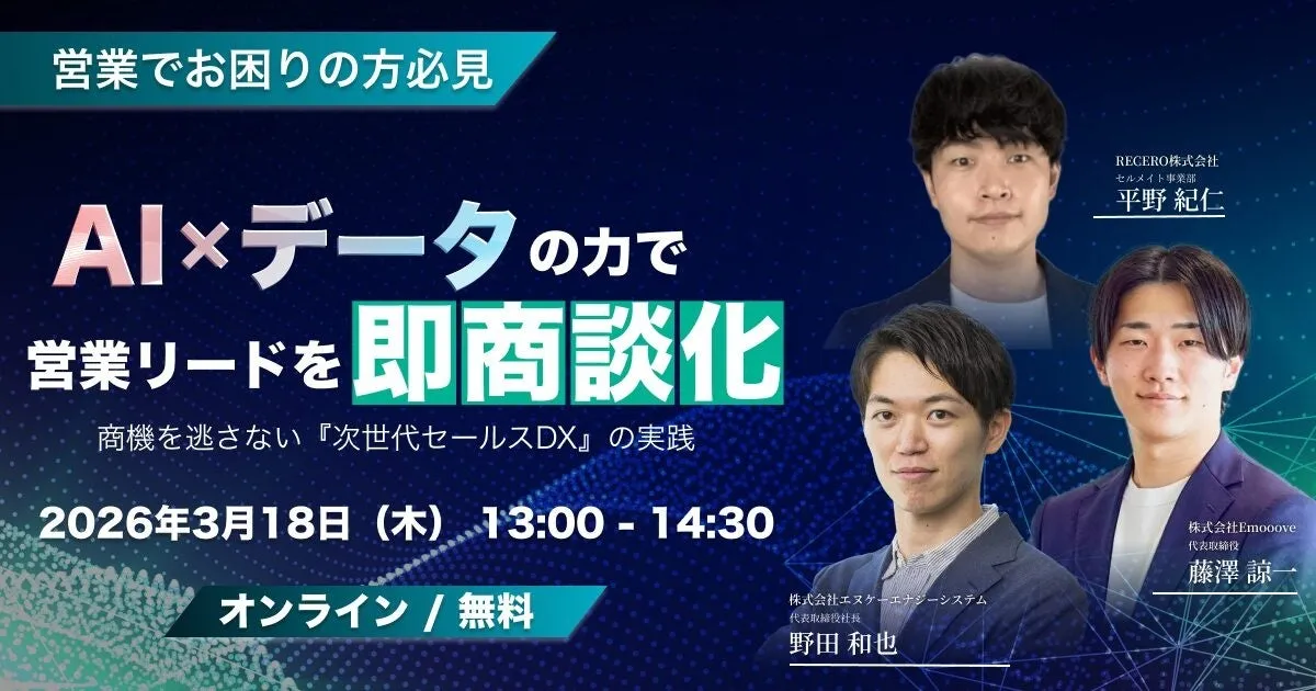 営業部門の効率的な運営が求められる現代において、株式会社Emoooveが主催するウェビナー『AI×データの力で営業リードを即・商談化!商機を逃さない「次世代セールスDX」の実践』が、2026年3月18日(水)に開催されます。当イベントは、営業部門の責任者や担当者を対象にしており、業務効率を改善するための新しい手法を具体的に学ぶ絶好の機会です。