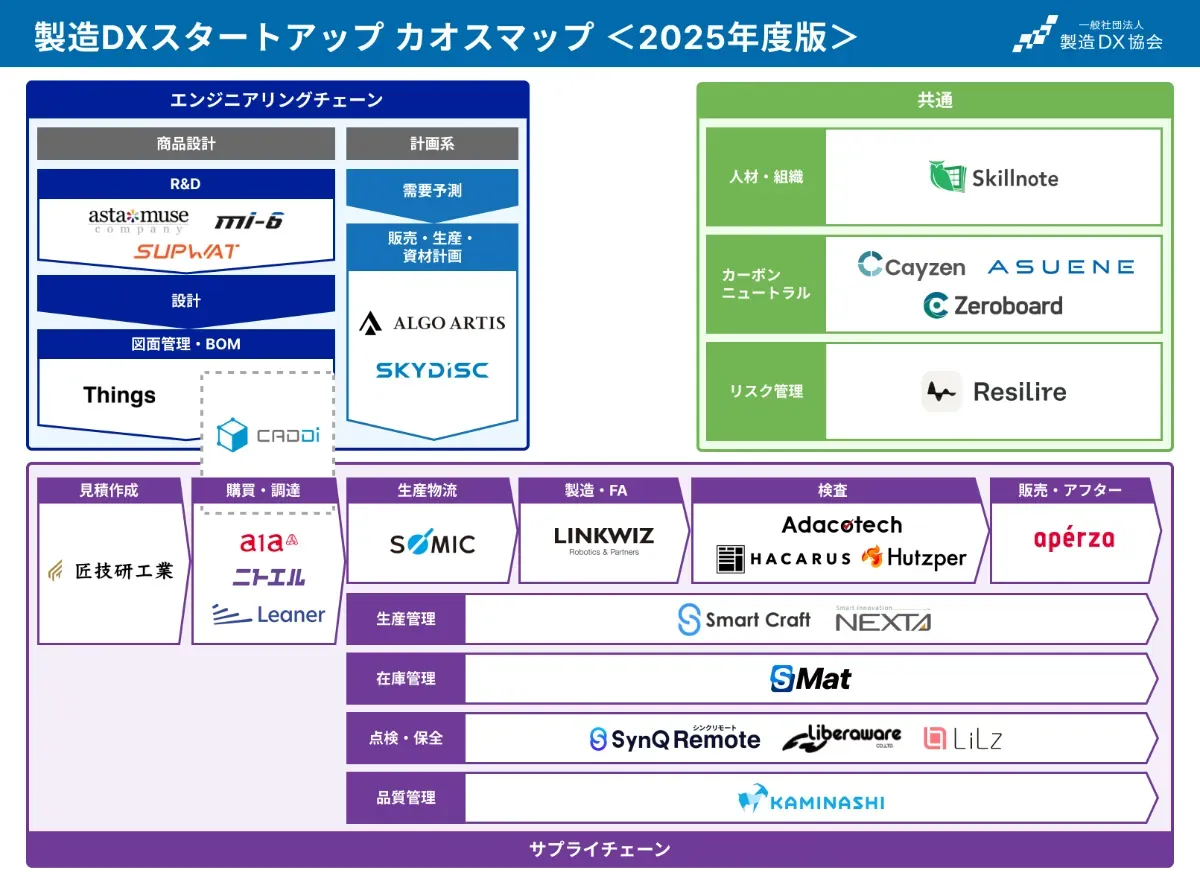 日本の製造業をより効率的かつ安全に進化させることを目指す一般社団法人製造DX協会が、2025年3月27日(木)に新たに発表した「製造DXスタートアップ カオスマップ」。これは、製造業におけるデジタル・トランスフォーメーション(DX)に取り組む日本国内のスタートアップを体系的に整理したもので、多くの企業が参考にできる貴重な資料となっています。
