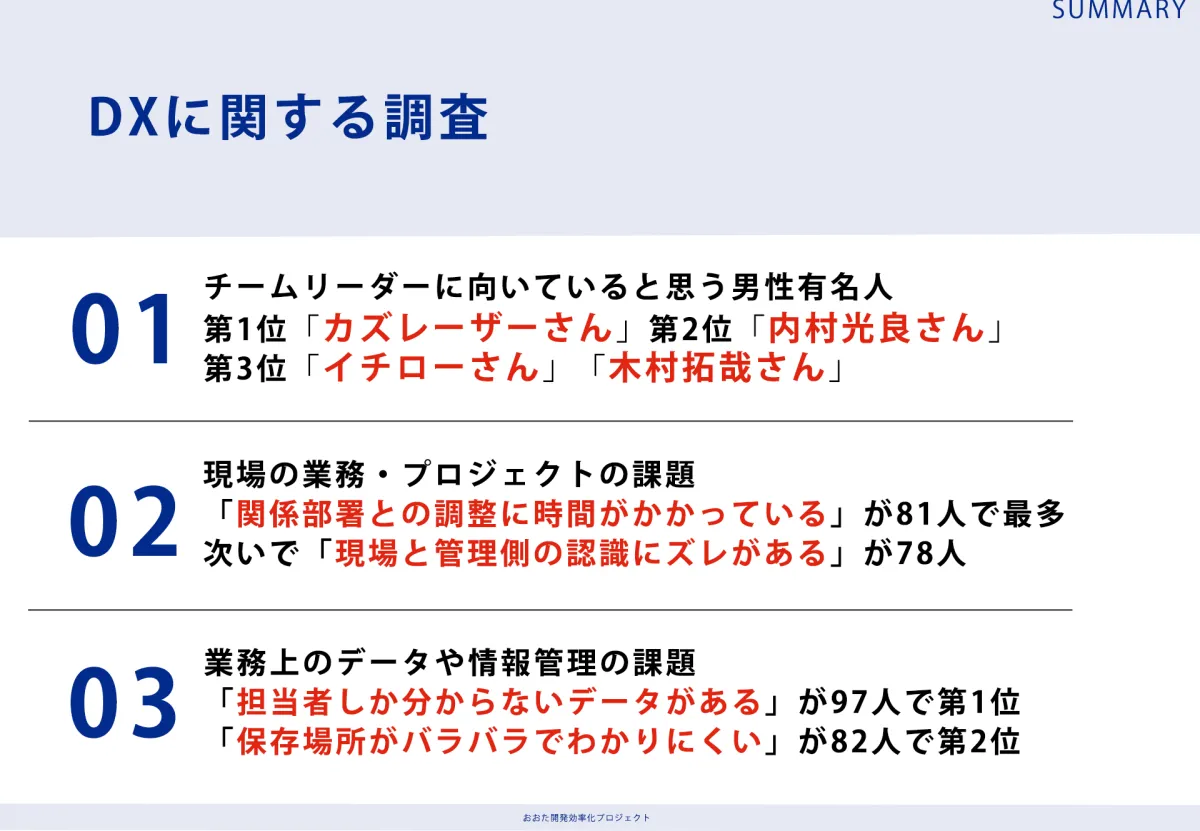 さらに、業務のデータや情報管理においても課題が多く報告されています。特に「担当者しかわからないデータがある」との回答が97人に上り、データの位置づけや管理方法の見直しが急務であることがうかがえます。保存場所のわかりにくさや、探すのに時間がかかるデータの管理は、業務の非効率につながっており、早急な改善が求められています。