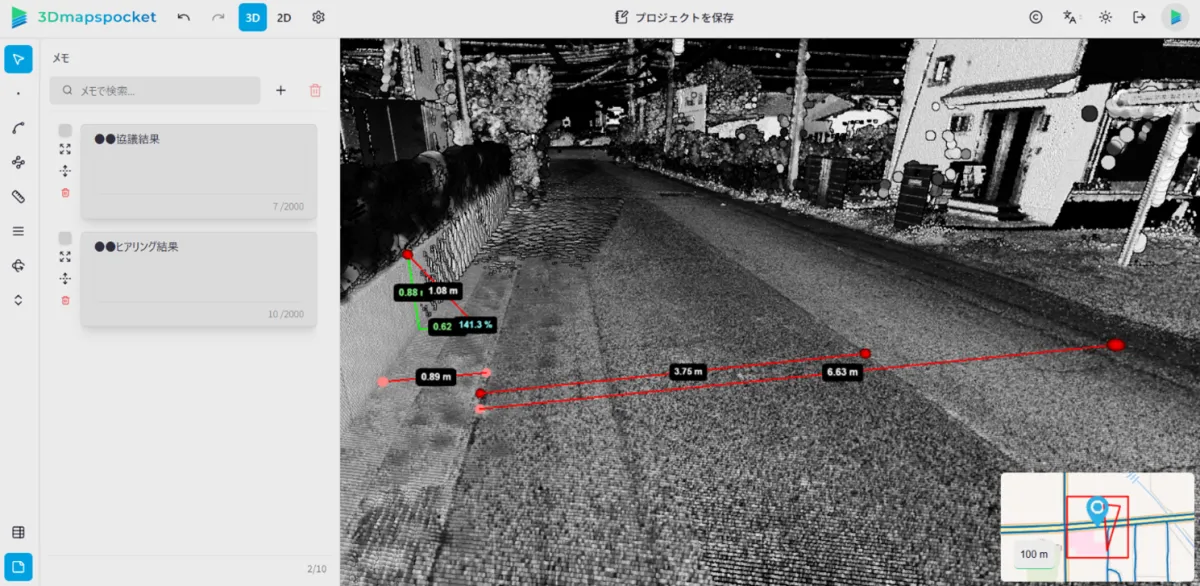 加えて、メモや距離、勾配の計測結果をプロジェクトとして保存できる機能も備わりました。これにより、一つのプロジェクトに関連する情報を一括管理することが可能となり、業務の効率化が促進されます。ユーザーは必要な情報に迅速にアクセスできるため、スピーディな意思決定が可能となります。