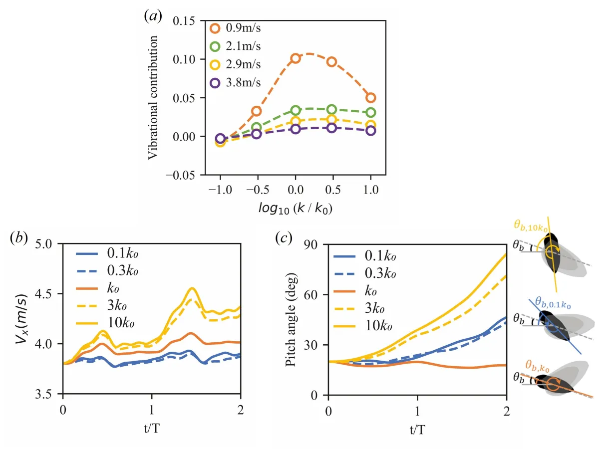 飛行速度に応じて、安定化のメカニズムが変化することが判明しました。特に、低速飛行では、翅の振動によって生じる振動剛性がピッチ方向の安定性を維持します。一方、高速飛行には空気抵抗による減衰効果が大きく寄与します。