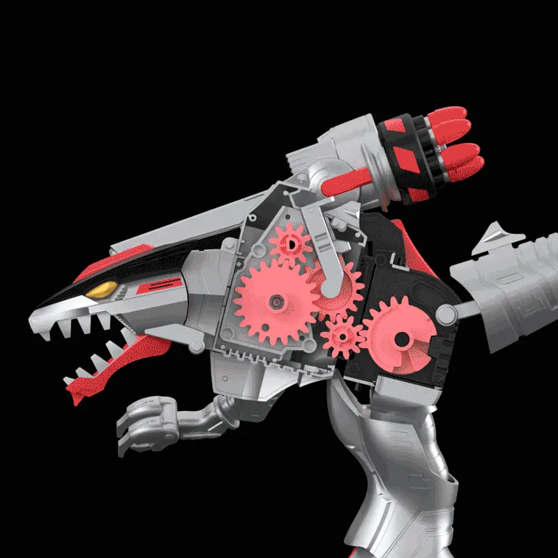 恐竜形態では、指、膝、足首など、全身約35か所が可動します。特に頭部の接続にはスライド式ボールジョイントを採用し、動きが自由自在。また、尻尾は各節ごとにボールジョイントで接続され、引き出すことでさらにフレキシブルな可動が可能です。同様に、ロボ形態でも関節が自動で動き、膝立ちなどのダイナミックなポージングを実現します。