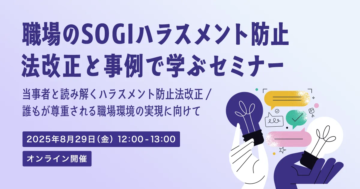 株式会社JobRainbowが主催するオンラインセミナー「職場のSOGIハラスメント防止 法改正と事例で学ぶセミナー」が、8月29日に再開催されます。このセミナーでは、職場でのSOGIハラスメントについての法改正点や、当事者のリアルな声を基にした事例を学ぶことができます。