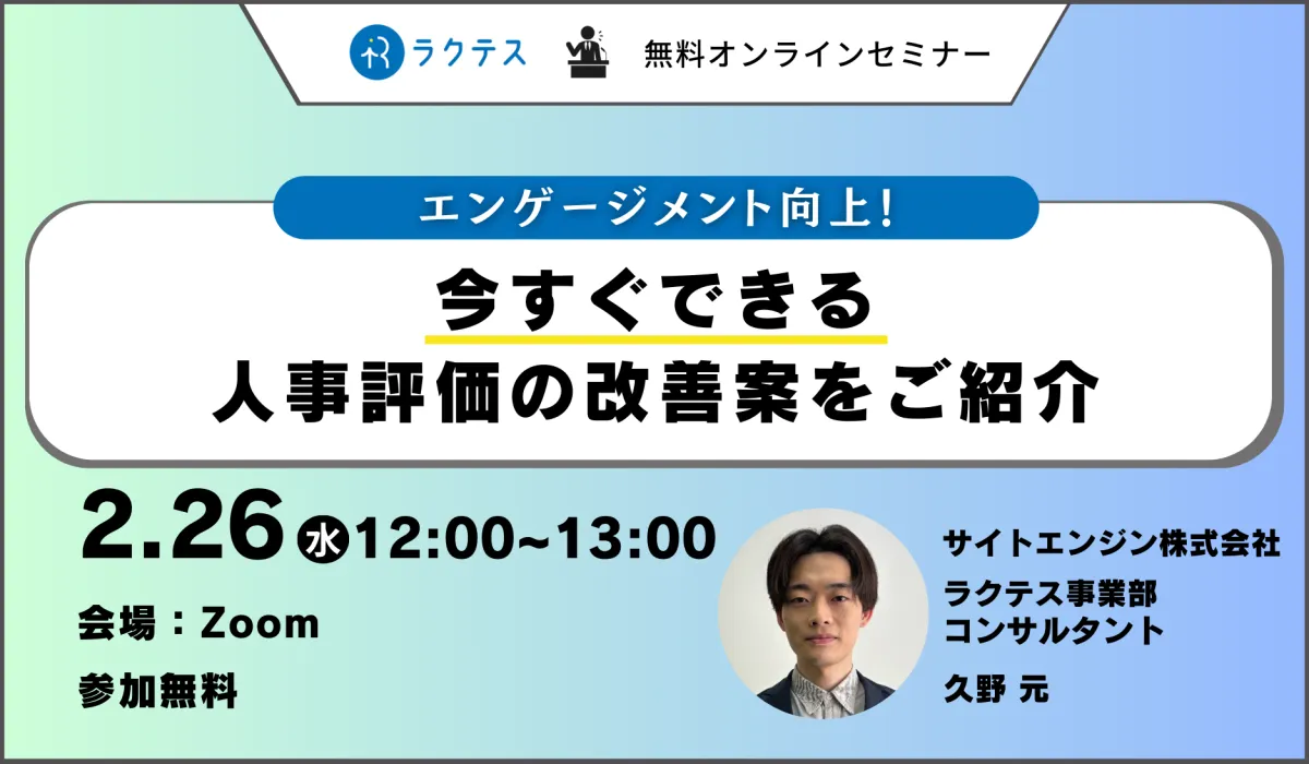 2025年2月26日、水曜日の午後12時より、サイトエンジン株式会社が主催するオンラインセミナー『エンゲージメント向上!今すぐできる人事評価の改善案』が開催されます。このセミナーでは、人事評価制度の「落とし穴」を見つけ出し、エンゲージメントを向上させる具体的な方法を参加者とともに探っていきます。