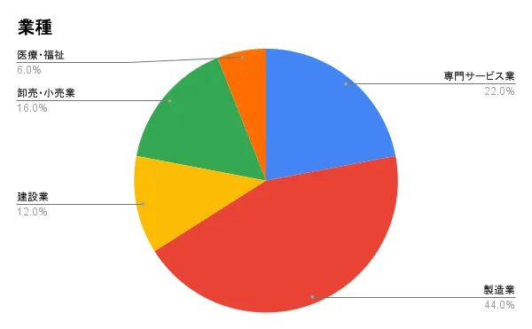 リソグラは、企業へのDX伴走支援において、主要な業種に亘るニーズを集計しました。この結果、製造業の企業が22社と最も多く、全体の44%を占めました。続いて、専門サービス業11社(22%)、卸売・小売業8社(16%)、建設業6社(12%)、医療・福祉3社(6%)という内訳になっています。