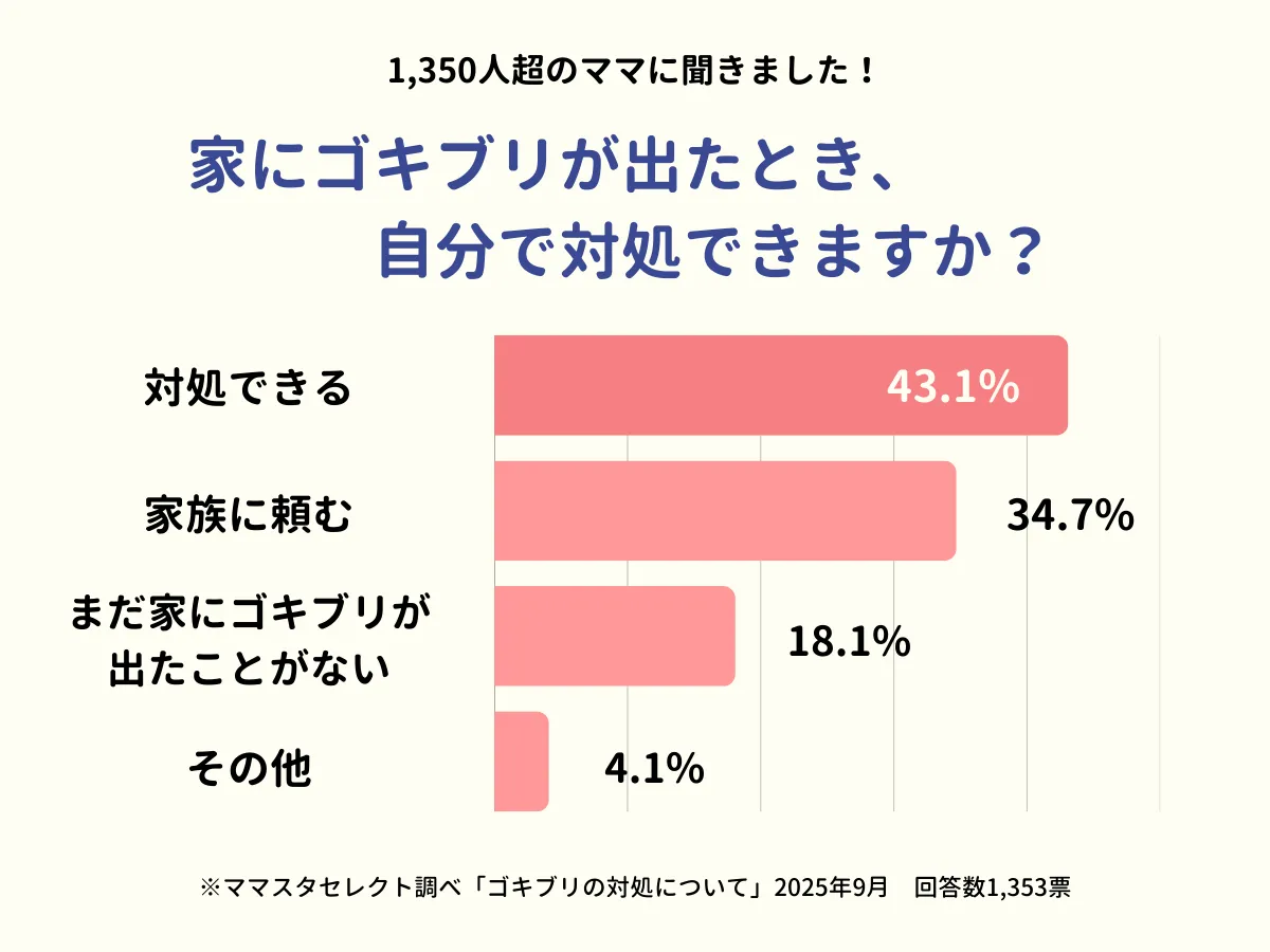 アンケートは「家にゴキブリが出たとき、自分で対処できるか?」というテーマで実施されました。選択肢は「対処できる」「家族に頼む」「まだ家にゴキブリが出たことがない」「その他」となっており、ママたちの率直な意見が集まりました。さっそく、結果を見ていきましょう。