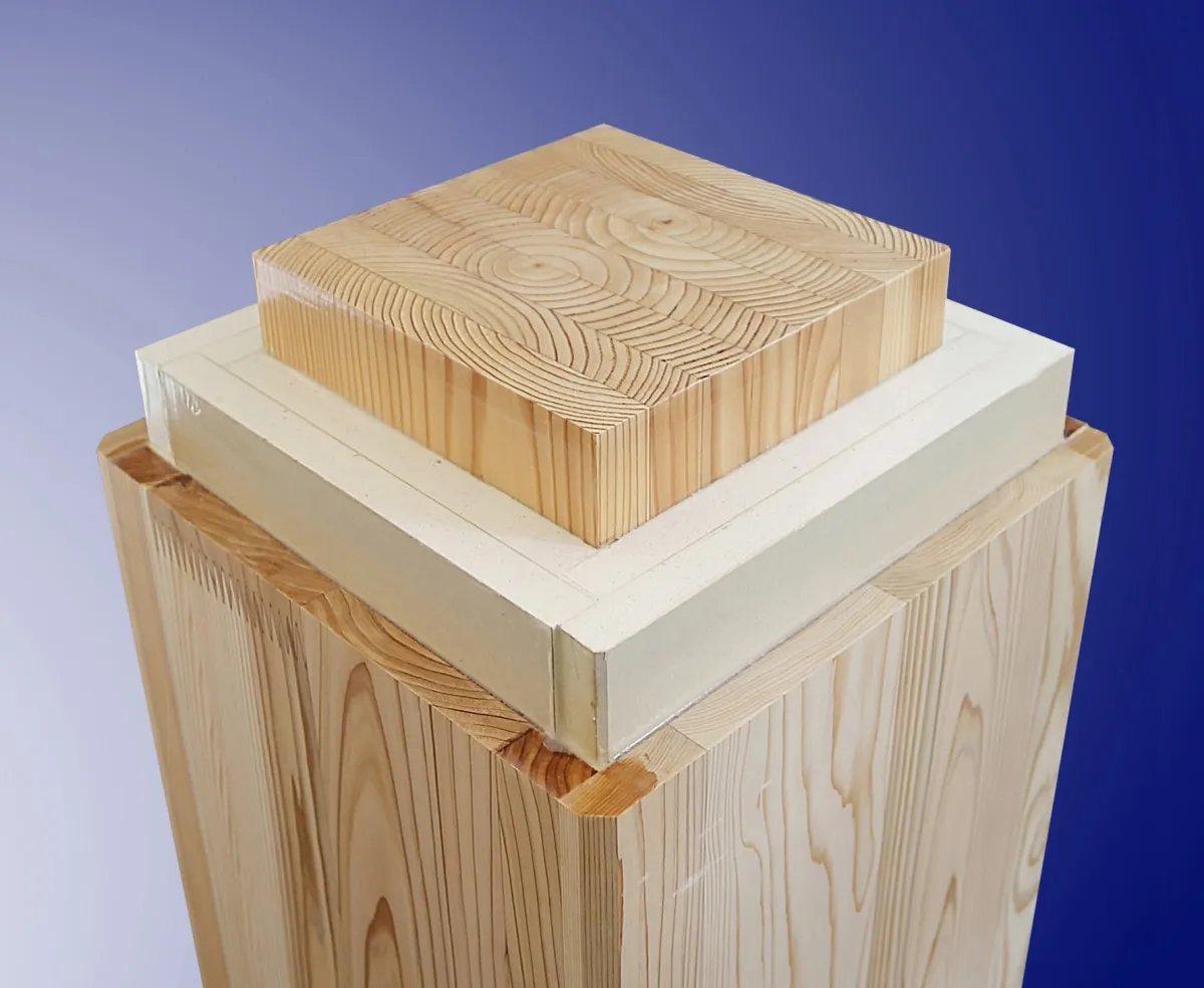 木質耐火部材COOL WOODは、耐火性能を持つ柱であり、燃え止まり層にせっこうボードを使用しています。1時間から3時間の耐火性能を持ち、日本、カナダ、スイスで特許を取得しています。特に日本では、高い耐火基準が求められています。