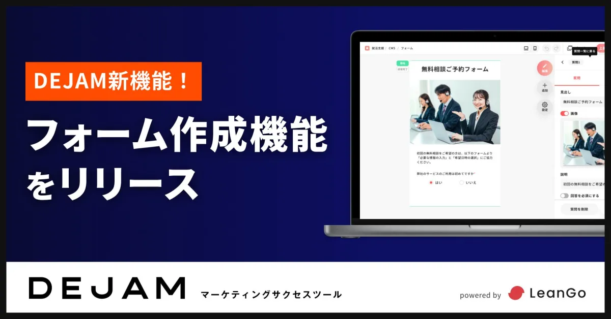 株式会社LeanGo(所在地:東京都目黒区、代表取締役CEO:平井翔吏)が、マーケティングサクセスツール「DEJAM」に新しく追加したフォーム作成機能のベータ版をリリースしました。この機能は、マーカーターがコード不要でリード獲得用のフォームを自ら設計・配置・改善することができ、効率的な施策実行を実現します。DEJAMのこの新機能によって、マーケティング活動は大きく変わることでしょう。
