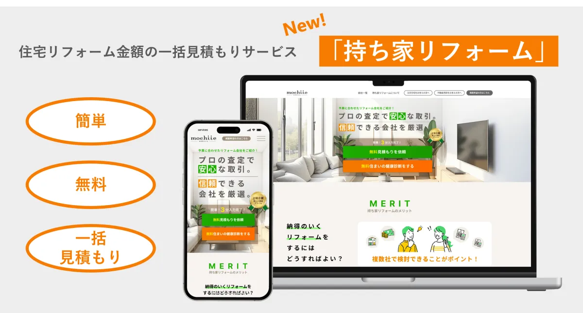 サービス名「持ち家リフォーム」は、ユーザーがリフォームを希望する個所と情報を入力するだけで、厳選された優良リフォーム会社からの見積もりを一括で受け取ることができるサービスです。このプロセスは非常にシンプルで、1度の入力で複数社に見積もり依頼が可能。これにより、リフォームの手間を大幅に省くことができます。