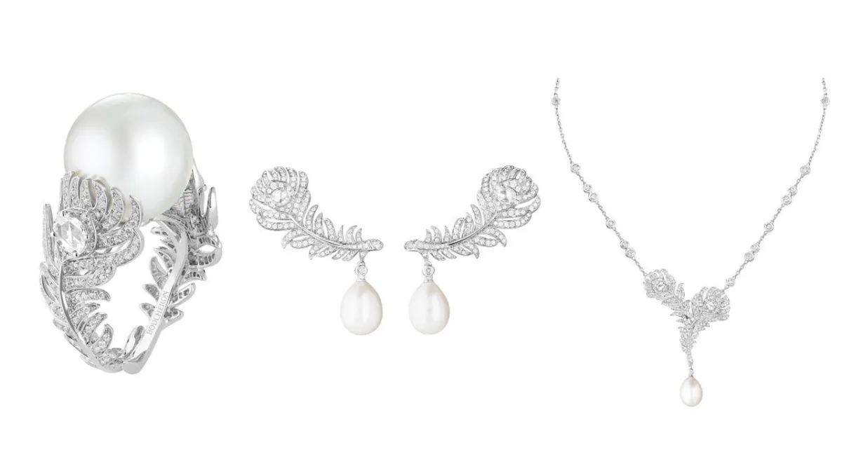 新コレクションには、パールを贅沢に使用したリング、ピアス、ペンダントが含まれています。これらの作品は、ブシュロンの技術の粋を集めたもので、ダイヤモンドやホワイトゴールドを駆使してクジャクの羽根の軽やかさを表現。特に、リングには大粒のホワイトサウスシーパールが配され、周りのダイヤモンドがその存在感を引き立てています。