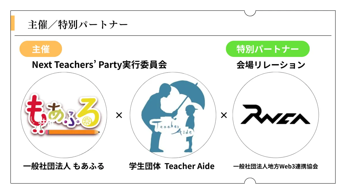 - - 主催: Next Teachers' Party実行委員会(一般社団法人もあふる、学生団体TeacherAide)