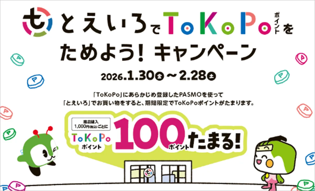 現在、「とえいろ」では、会員制ポイントサービス「ToKoPo」に登録したPASMOを活用した特別キャンペーンを行っています。このキャンペーンに参加することで、買い物を通じて「ToKoPo」ポイントを簡単に貯めることができます。以下の内容で実施中です: