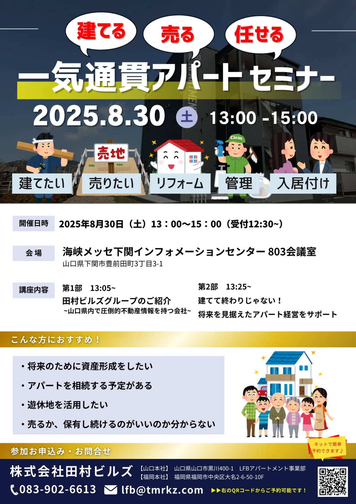 山口県の田村ビルズが主催する、アパート経営に特化したセミナーが2025年8月30日(土)に下関市で開催されます。このセミナーは、アパート経営に関心を持つ方に向けて、資産形成の重要性について学べる貴重な機会です。