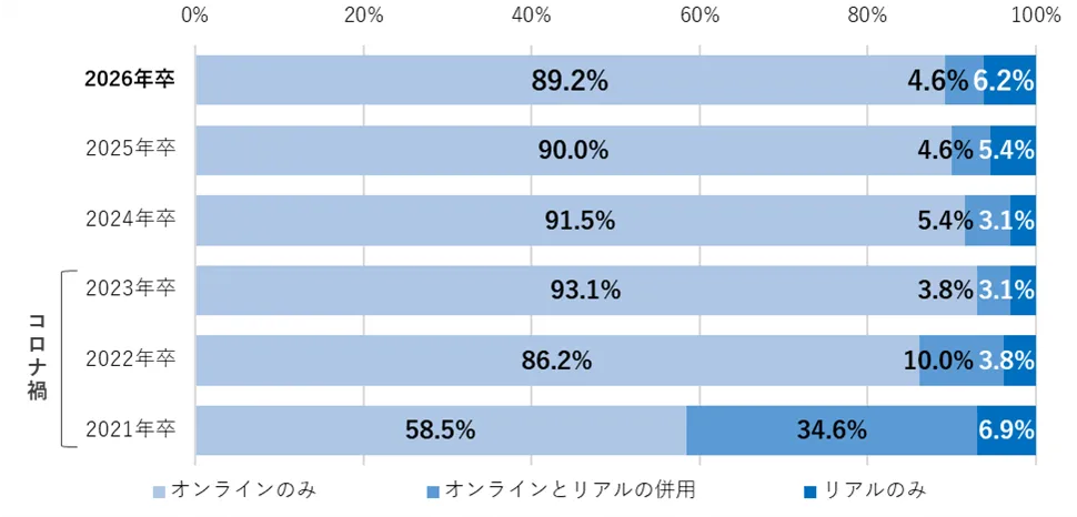 対する最終面接では、コロナ禍一年目の2021年には34%の企業が対面のみでの実施でしたが、2025年・2026年卒採用においては、なんと4社中3社(73%)が対面での実施に移行しています。これは企業が応募者に対する判断基準を高め、同時に自社の雰囲気を理解してもらうための戦略として見て取れます。