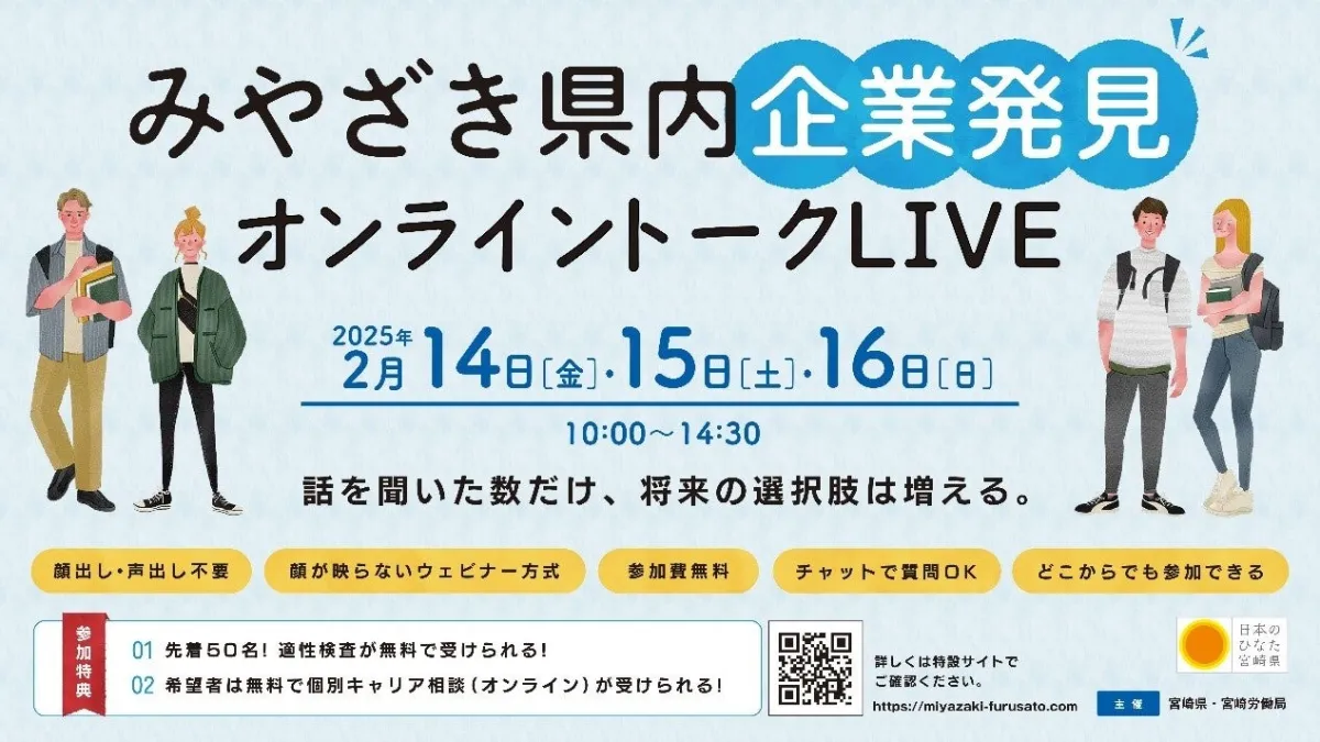 宮崎県では、県外に進学している大学生や県内での就職・転職を希望する一般の方を対象に、オンライン就職イベント「みやざき県内企業発見オンライントークLIVE」を開催します。このイベントには、約100社の宮崎県内企業が参加し、自社の魅力を直接伝える場となります。