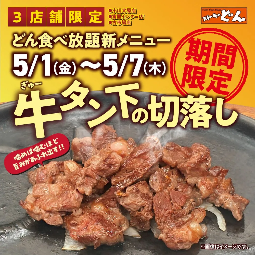 2026年5月1日から5月7日までの期間、栃木県の小山犬塚店と、千葉県の富里インター店・古市場店の3店舗で、『牛タン下の切落し』を楽しめる食べ放題が開催されます。この特別メニューは、食べ放題のアイテムとして初登場。びっくりするほどの旨味と独特の食感を誇る牛タン下部位を存分に味わうチャンスです!