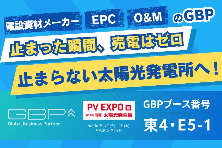 再生可能エネルギーの総合ソリューションを提供するGBP株式会社は、2026年3月17日(火)から19日(木)まで東京ビッグサイトで開催される第22回春のPV EXPOに出展します。今回の展示テーマは「止まらない太陽光発電所へ」。これは、発電所の長期的な安定運用を実現し、収益最大化を目指すための取り組みを示しています。 GBPのブースにお立ち寄りいただき、直接課題をご相談いただければ幸いです。