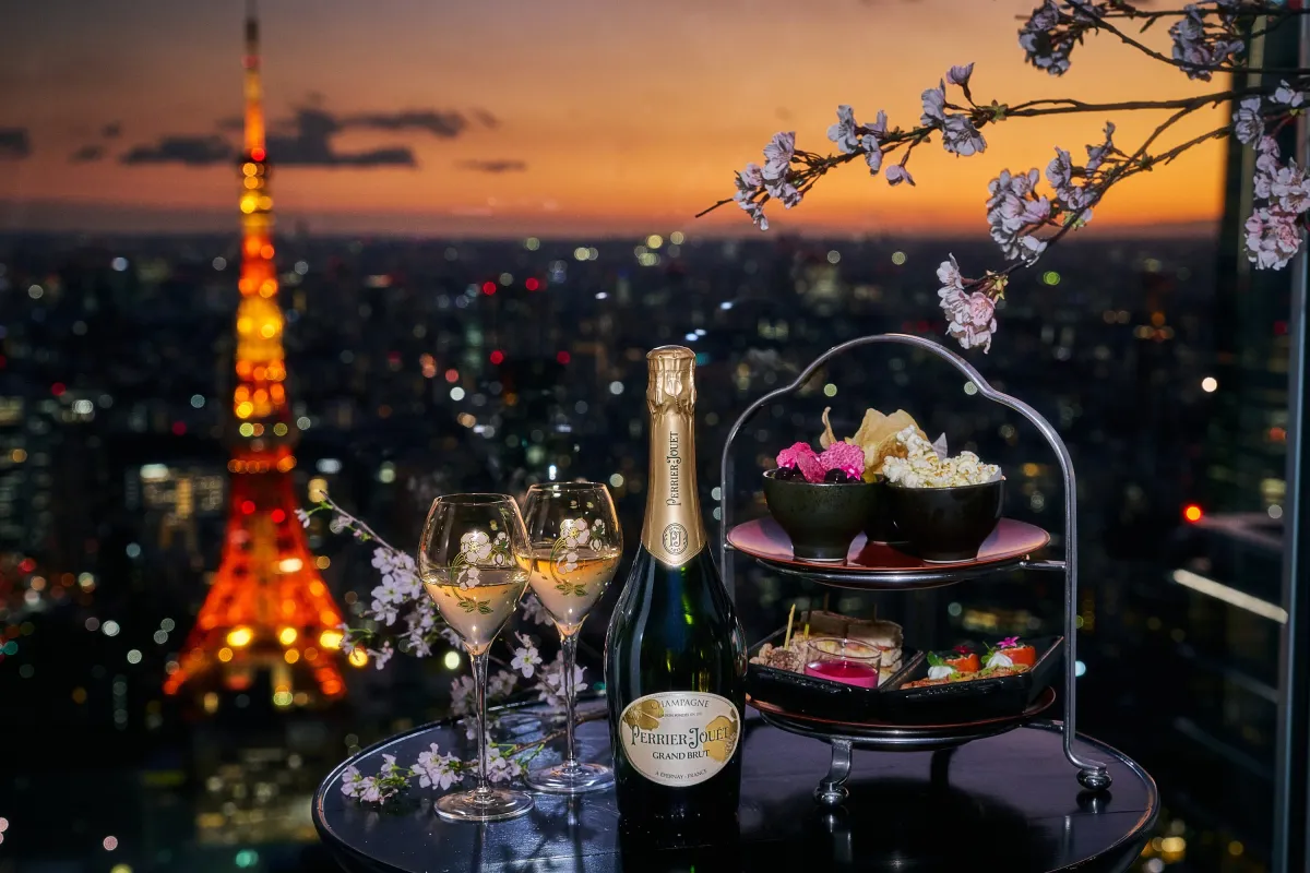 「夜桜プレミアムビュープラン」は、2025年4月4日から4月20日までの期間限定で提供され、毎日わずか18組のお客様のみがこの特別な体験を楽しむことができます。地上約250mの高層階からの東京の美しい夜景をバックに、咲き誇る夜桜を眺めながら、ペリエ ジュエ グラン ブリュットを堪能できます。
