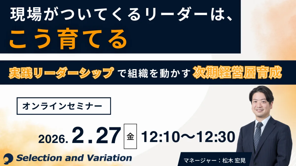 企業の成長には、次世代の経営層を育てることが不可欠です。そこで、セレクションアンドバリエーション株式会社が主催する「現場がついてくるリーダーは、こう育てる~実践リーダーシップで組織を動かす次期経営層育成~」のセミナーが2026年2月27日(金)に開催されます。このオンラインセミナーは、実務で即通用するスキルをライブに学び、組織変革を主導できるリーダーを目指す方に最適です。