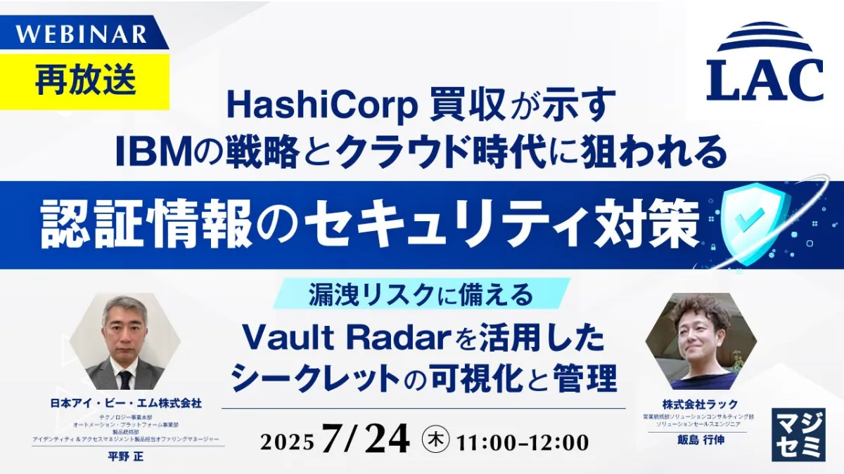 本ウェビナーでは、IBMによるHashiCorpの買収が企業のクラウドセキュリティ戦略にどのような影響をもたらすのか、背景や狙いについて詳しく解説します。また、HashiCorpが提供する「Vault Radar」を活用し、日々の運用で見落としがちな認証情報をどう可視化し、セキュリティリスクに備えることができるのかを具体的に紹介します。これにより、出席者は運用における重要なポイントを理解し、実践的な知識を得られることでしょう。