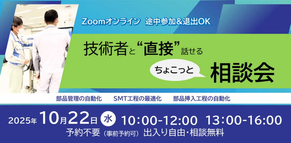 この相談会は、実際にSMT(表面実装)、MI(異形部品挿入機)、ISM(自動倉庫システム)を導入・運用したい方々や、日常的に製造現場の改善を考えている技術者、購買部門、生産管理部門の方々を対象としています。特に、現場の課題を抱える方々には、大いに役立つ内容となっています。