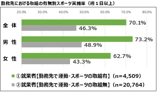 調査結果にあたるデータを見てみると、勤務先での「運動・スポーツを活用した取り組み」の有無が、週に1回以上のスポーツ実施率に明確な影響をもたらしていることがわかりました。具体的には、取り組みが行われている職場では実施率が70.1%に達する一方で、なされていない職場では46.3%という低い結果が出ています。この約25%もの差は驚くべきものです。