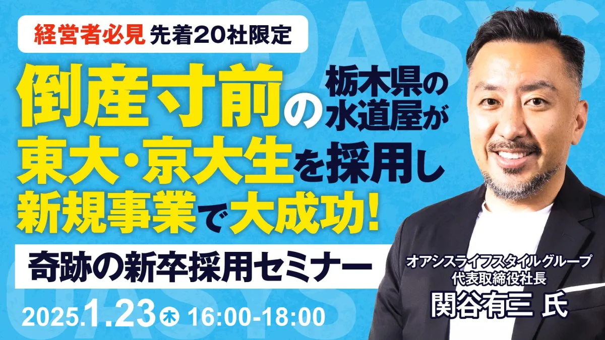 2025年1月23日、東京都渋谷区にある株式会社あつまるの東京本社で、株式会社オアシスライフスタイルグループの関谷有三社長を招いた特別セミナー「奇跡の新卒採用セミナー」が開催されます。新卒採用に取り組む全ての方々に向けたこのセミナーは、先着20社様限定での開催となるため、早めの予約が推奨されています。