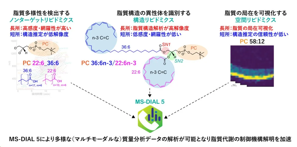 「MS-DIAL 5」は、脂質の多様性のプロファイリング、異性体の同定、および脂質の局在の可視化を行うことができます。この新しいプログラムは、さまざまな質量分析法を適用し、多種多様なデータを統合的に解析することを可能にします。その結果、研究者たちは脂質代謝のメカニズムを深く理解し、生命科学の基礎・応用研究において革新を促進することができるのです。