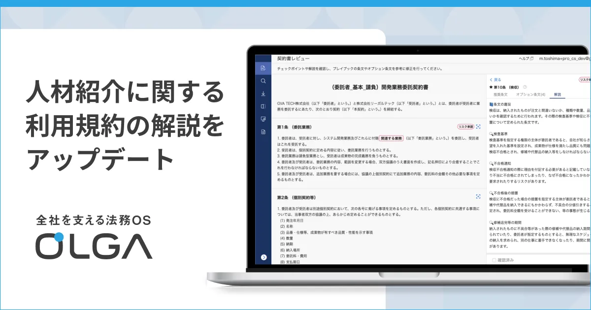 今回のアップデートでは、特に人材紹介サービスに関連する利用規約が重視されています。OLGAのプレイブックは、契約書のレビューを行う際に必要なさまざまな情報を提供しています。具体的には、契約書の内容やその意味、注意すべきポイントに加えて、譲歩すべき条件の順位や関連情報などが詳述されています。
