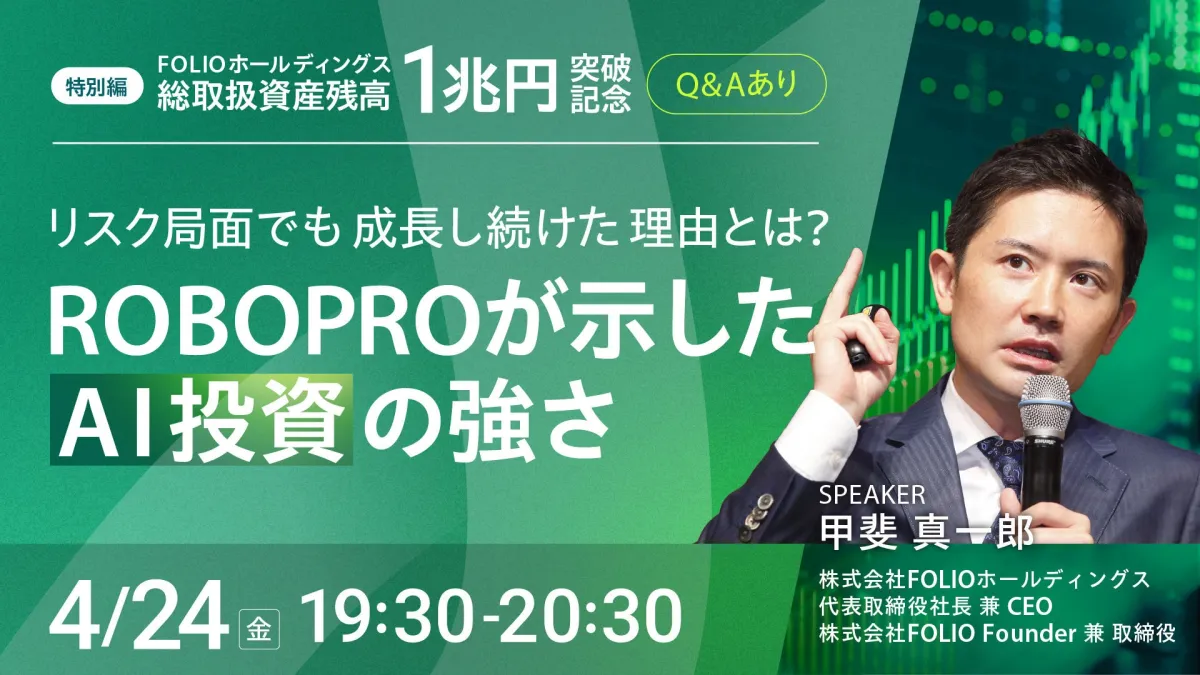 FOLIOホールディングス株式会社は、1兆円を越えた総取扱資産残高を記念して、「リスク局面でも成長し続けた理由とは?ROBOPROが示したAI投資の強さ」と題した特別セミナーを開催します。このイベントは、株式会社FOLIOの創業者である甲斐真一郎氏が講師を務める予定です。